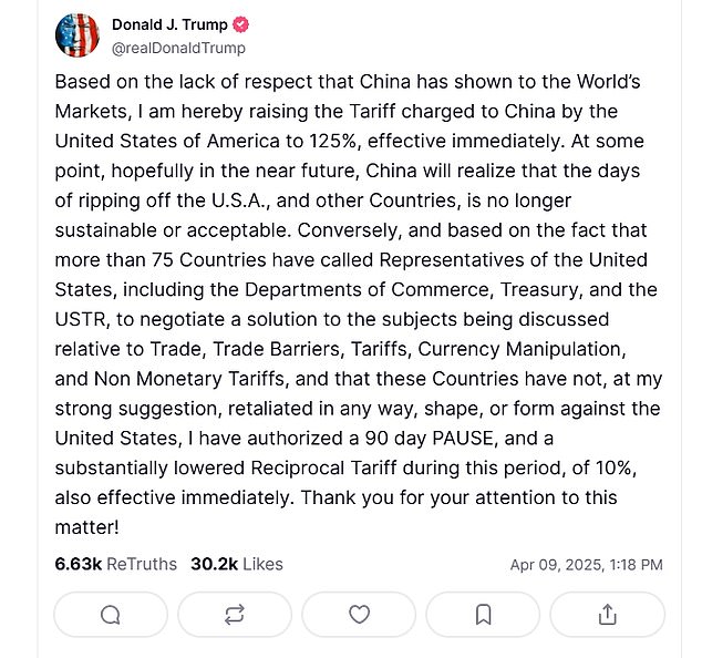 Mr. Trump stated that he would increase tariffs on Chinese products to 125 percent right away due to Beijing's 'disrespect'.