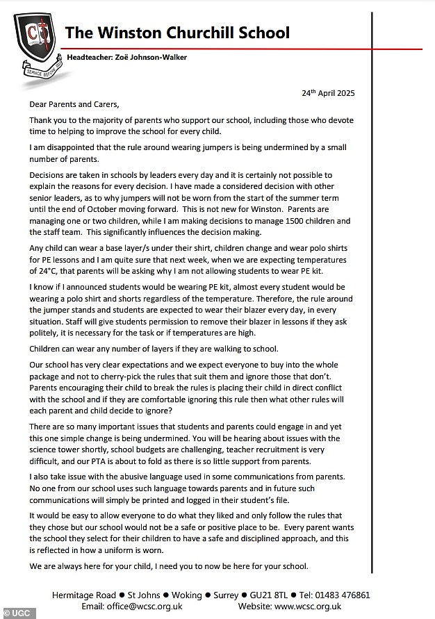 The school's principal, Zoe Johnson-Walker, hasn’t yet clarified the rationale for the ban but has responded with a highly critical letter, obtained by MailOnline.